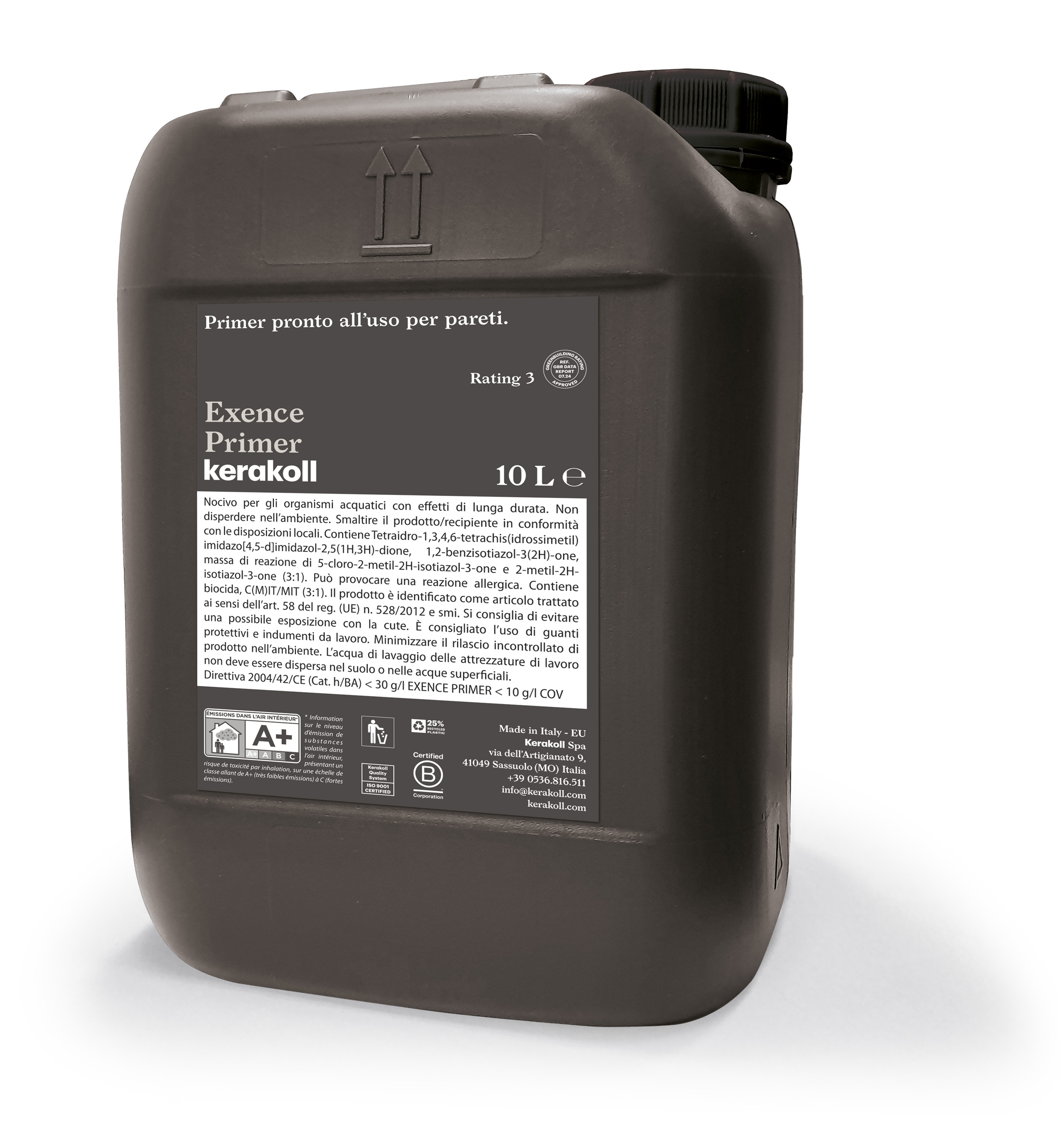 Exence Primer is a ready-to-use, water-based fixing primer for interior walls, designed to ensure uniform absorption and chromatic homogeneity of decorative coatings.