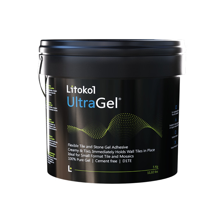 Ready-to-use, flexible Fluidotixo® polymer Gel, for the installation of small-format tiles, mosaics, and porcelain stoneware in indoor settings. Thixotropic with extended open time.