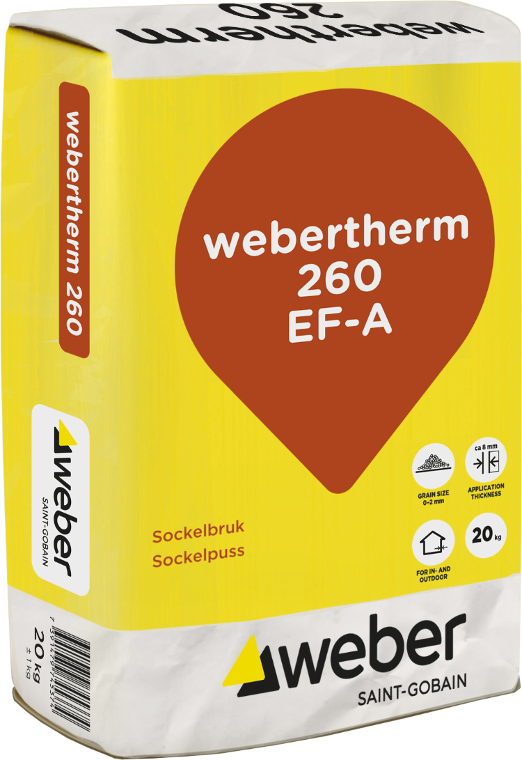 webertherm 260 EF-A sockelbruk is a polymer and fiber-reinforced dry mortar. It is used as plaster mortar in Weber’s plinth system and on surfaces where high strength and durability are required, e.g. for plaster that goes below ground level.