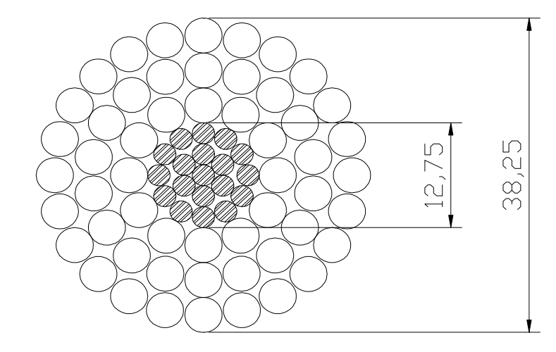 The overhead conductor ACSR Ø38,25 mm Parrot conductor consists in several galvanized steel wires and several aluminium wires stranded in layers.