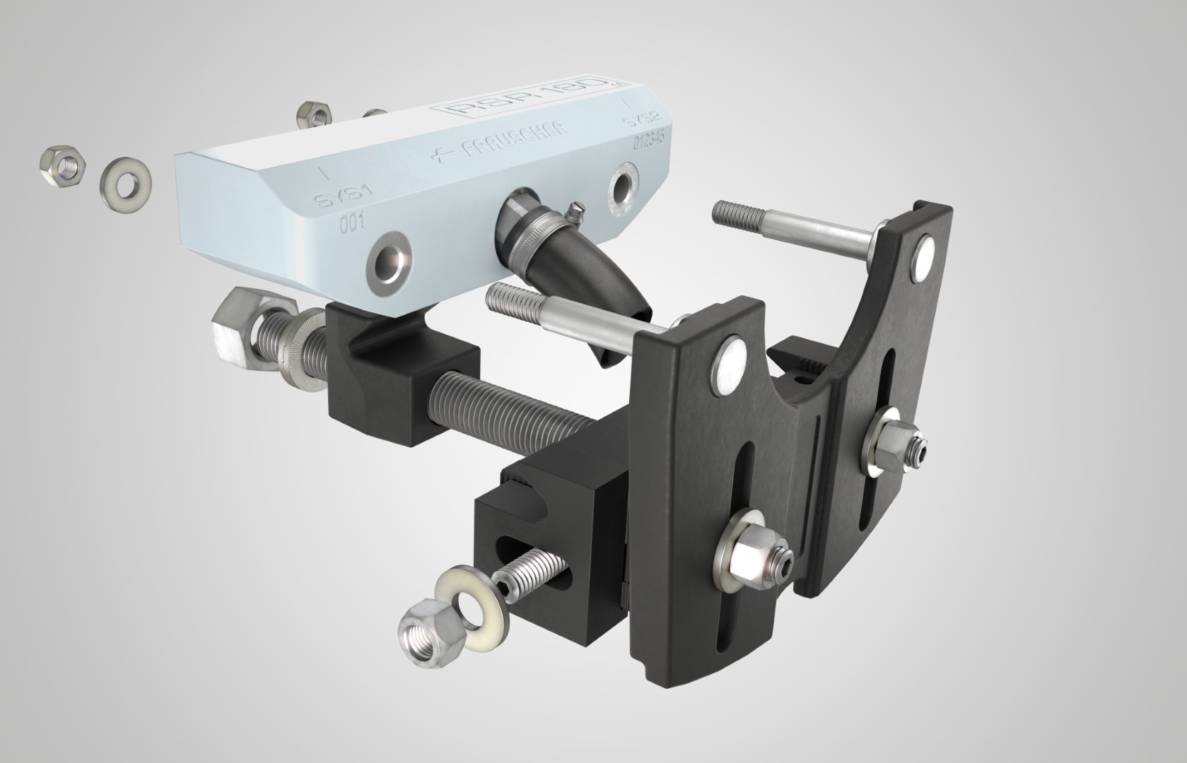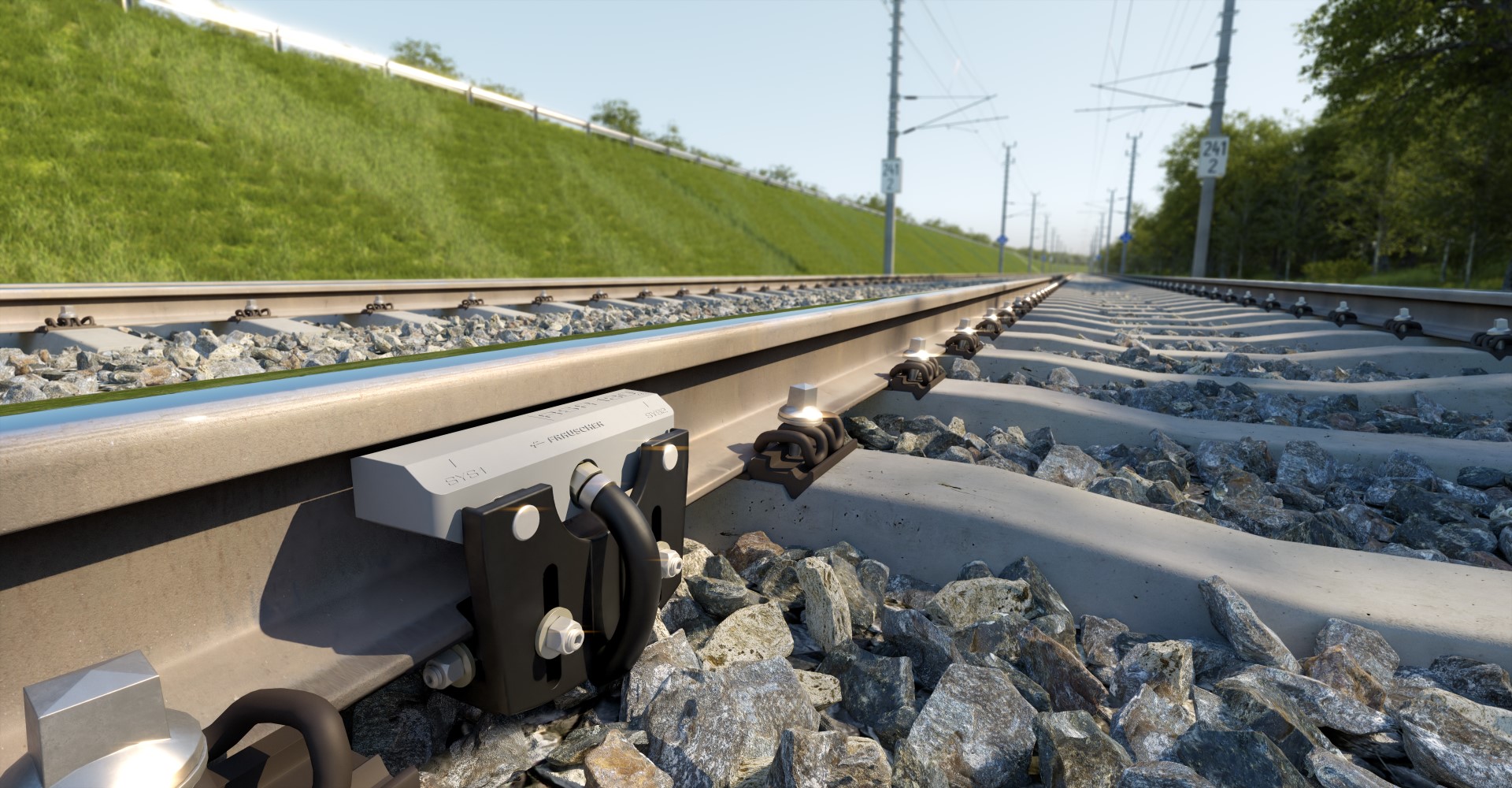 The wheel sensor RSR180 (1) is an electrical sensor based on an inductive principle for wheel detection. The wheel sensor RSR180 is equipped with a cast-in connection cable (2) and fixed to the rail foot by means of the rail claw SK150 (3).
