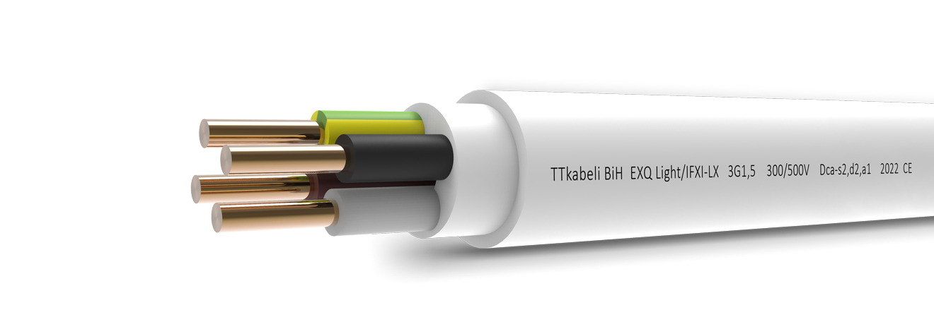The cables in this group are foreseen by the following applications: for fixed surface and flush- mounted installations, indoors and outdoors. These cables are recommended for use in public and industrial settings whenever good fire retardant qualities, reduced fumes, toxic and corrosive gases emissions are required in the case of fire. Environment working temperature of these cables: -15 °C to +90 °C. As the representative product in this group of cables following cable was chosen: EXQ Light 3x2.5.