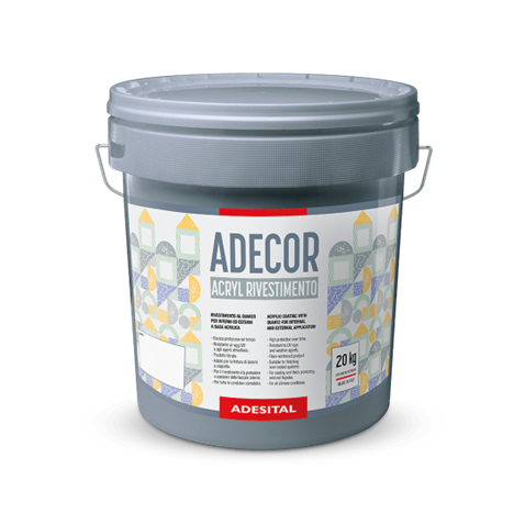 ADECOR ACRYL RIVESTIMENTO is an acrylic coating in water dispersion with a particle size of 1.2mm and 1.5 mm quartz, with high protection, for exterior and interior use.