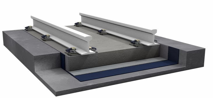 The Pandrol FSM are a family of continuous resilient solutions used in Floating Slab Track vibration insulation systems. The Pandrol FSM-L13 solution is composed of 2 elements: an active resilient layer made of high-quality resin-bonded recycled rubber defining the static and dynamic stiffness, and a separate top protection layer made of non-woven geotextile. The Pandrol FSM-L13 has a total weight of 16 kg/m² using more than 90% of recycled rubber granules coming from End-of-Life tyres.