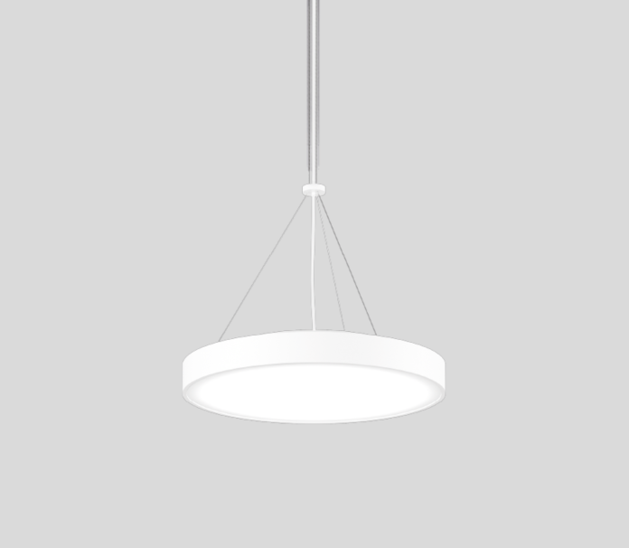 Round luminaire housing in aluminium, rolled profile, seamlessly welded. Suspended luminaire with 1500mm cable suspension. The product is available with opal and microprismatic cover.