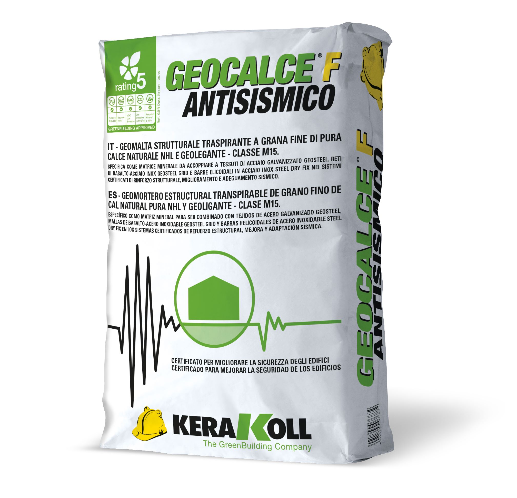 Geocalce F Antisismico is a breathable structural geomortar with fine grain, formulated with pure natural hydraulic lime (NHL) and geobinder, classified as M15 (EN 998-2) and R1 (EN 1504-3). It is specifically designed as a mineral matrix for certified structural reinforcement, enhancement, and seismic retrofitting, in combination with Geosteel galvanized steel fabrics, Geosteel Grid basalt-stainless steel fabrics, and Steel Dryfix stainless steel helical bars.