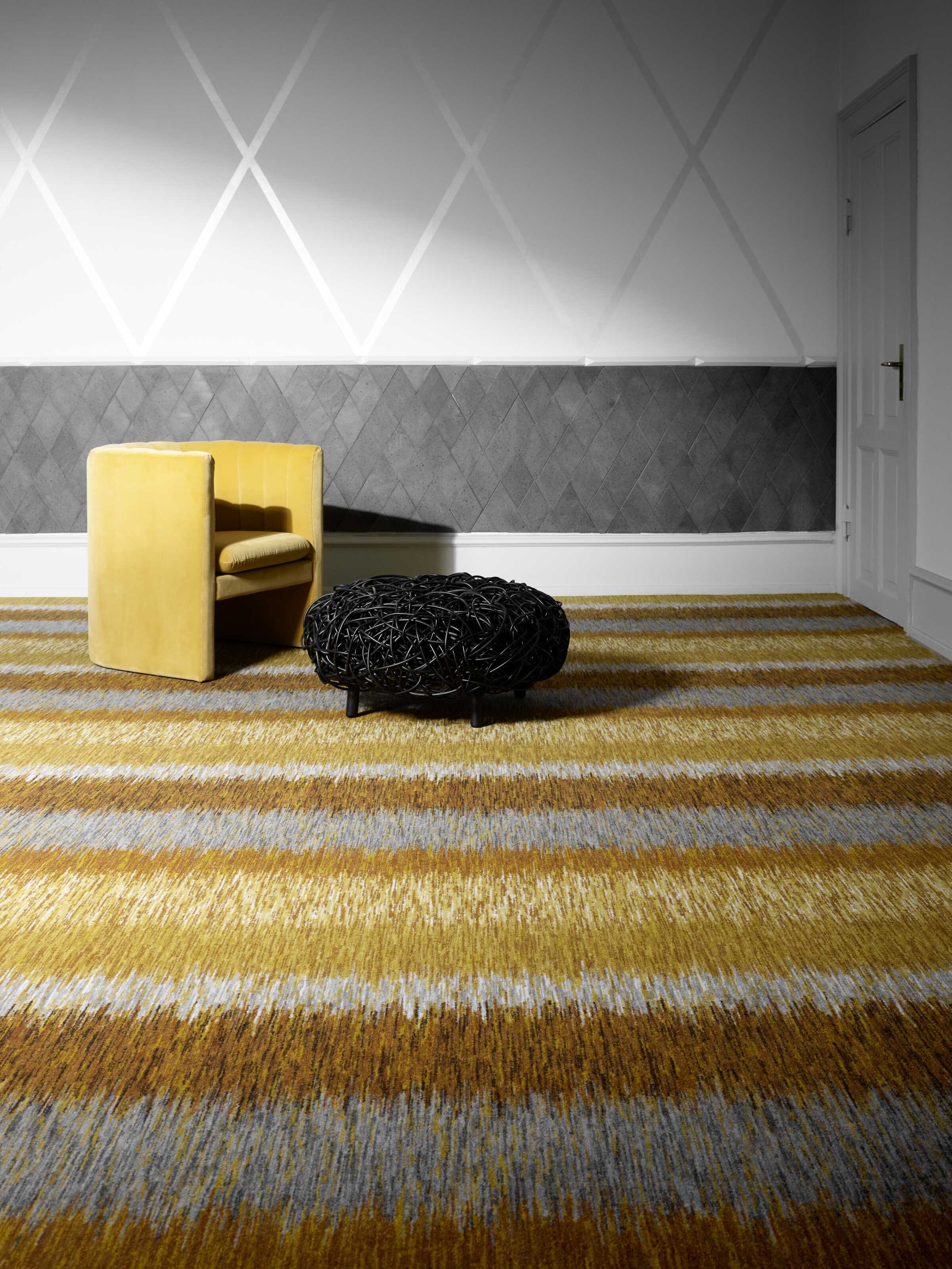 Tufted wall-to-wall carpet with wool pile material and Acoustic Backing. Millitron dyeing method. Total thickness: approx. 13,5 mm. Surface pile mass 1900 g/m2. Use classes according to CEN/TS 15398 : Class 33 – Commercial – Heavy.