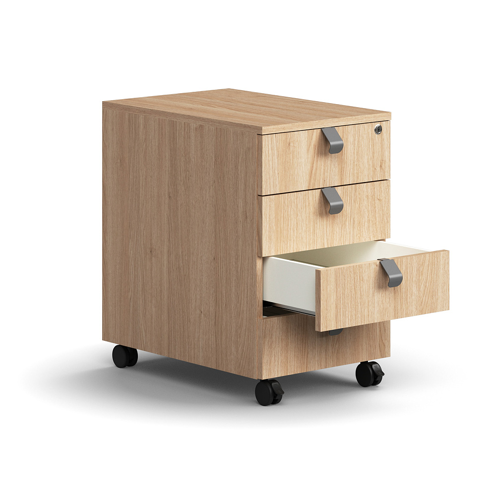 A modular laminate mobile pedestal designed for efficient storage of office supplies and personal items. The QBUS range is expandable, allowing for seamless integration of additional units.