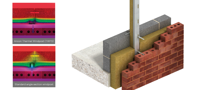 The revolutionary Ancon Thermal Windpost (TWP2) is designed to span vertically between floors, to provide additional lateral support for panels of masonry. It has been specially designed and engineered after extensive research and testing, with a variety of features to improve the thermal performance and repeatability of the junction. With robust integral non-combustible mineral fibre insulation in combination with a thermal slot array, using the Thermal Windpost in place of a traditional windpost results in up to 70% reduction in thermal transmission through the span of the section, as well as improving the consistency and repeatability of fitting insulation in and around the post, ensuring that the intended thermal design is met.