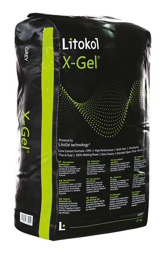 Fluidotixo® polymeric Gel (1st generation) for the installation of ceramics, porcelain stoneware, and natural stones both indoors and outdoors. Designed for high application safety and thanks to state-of-the-art features, the mixture is extremely creamy, fluid, and thixotropic. It maintains its shape and thickness unchanged on floors and walls with a 100% wetting power, resistance to vertical slip, and an open time of over 40 min. It performs exceptionally well for installation over existing surfaces, ensuring superior adhesion even on challenging substrates.