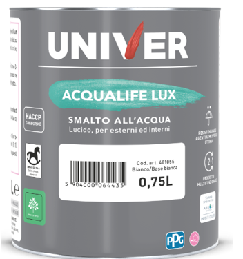 Lux Water based acrylic enamel for interior and exterior, suitable for direct application on wall surface in good condition, non-ferrous metals, PVC and glass. With the use of a primer suitable for ferrous and wooden surfaces. Excellent opacity, very good weather resistance, no yellowing during the time. HACCP certification available.