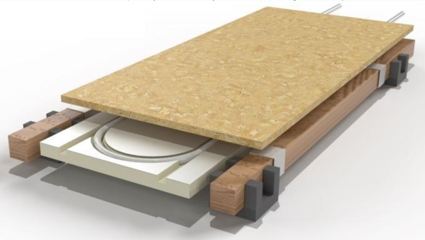 Acoustic Raised Flooring System with an Underfloor Heating Option, plastic joists held up on rubber cradles with support a chipboard floor above, with underfloor heating pipes and mineral wool and/or XPS board between the joists.