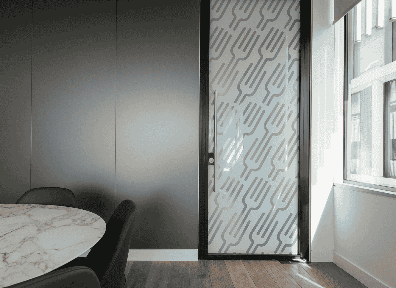 The single glazed Edge Symmetry is a hugely popular aluminium framed door offering excellent acoustic performance. This elegant door is designed for use within our Microflush door frame and can be hinged or pivoted.