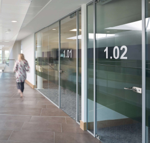 Axile Clarity is an elegant frameless toughened glass door leaf with a slimline Microfush aluminium door frame which incorporates integral acoustic seals and a glazing rebate to allow seamless integration with Optima’s single glazed or double glazed partitioning systems.