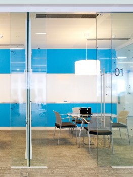 The Kinetic Lite door consists of a 10mm heat-soaked toughened glass leaf acting on carriages within a robust head track, thus providing seamless integration with Optima 117 Plus partition system