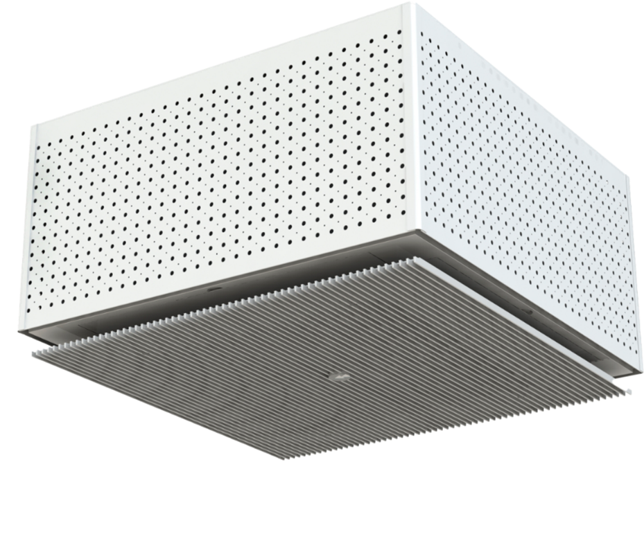 The Box device is available in two sizes designed for mounting on a modular ceiling: 600x600 mm and 600x1200 mm. For spaces without a false ceiling, the device can be equipped with a protective cover. The fan coil unit’s EC grille guarantees silent and draught-free cooling operations. The Coanda effect takes place even with low air volumes, resulting in significant reductions in energy consumption and sound levels. The grille enables the use of different airflow directions. Box fan coil units can also be equipped with a fresh air supply connection