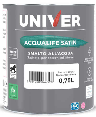 Satin Water based acrylic enamel for interior and exterior, suitable for direct application on wall surfaces in good condition, non-ferrous metals, PVC and glass. With the use of a primer suitable for ferrous and wooden surfaces. Excellent opacity, very good weather resistance, no yellowing during the time. HACCP certification available.