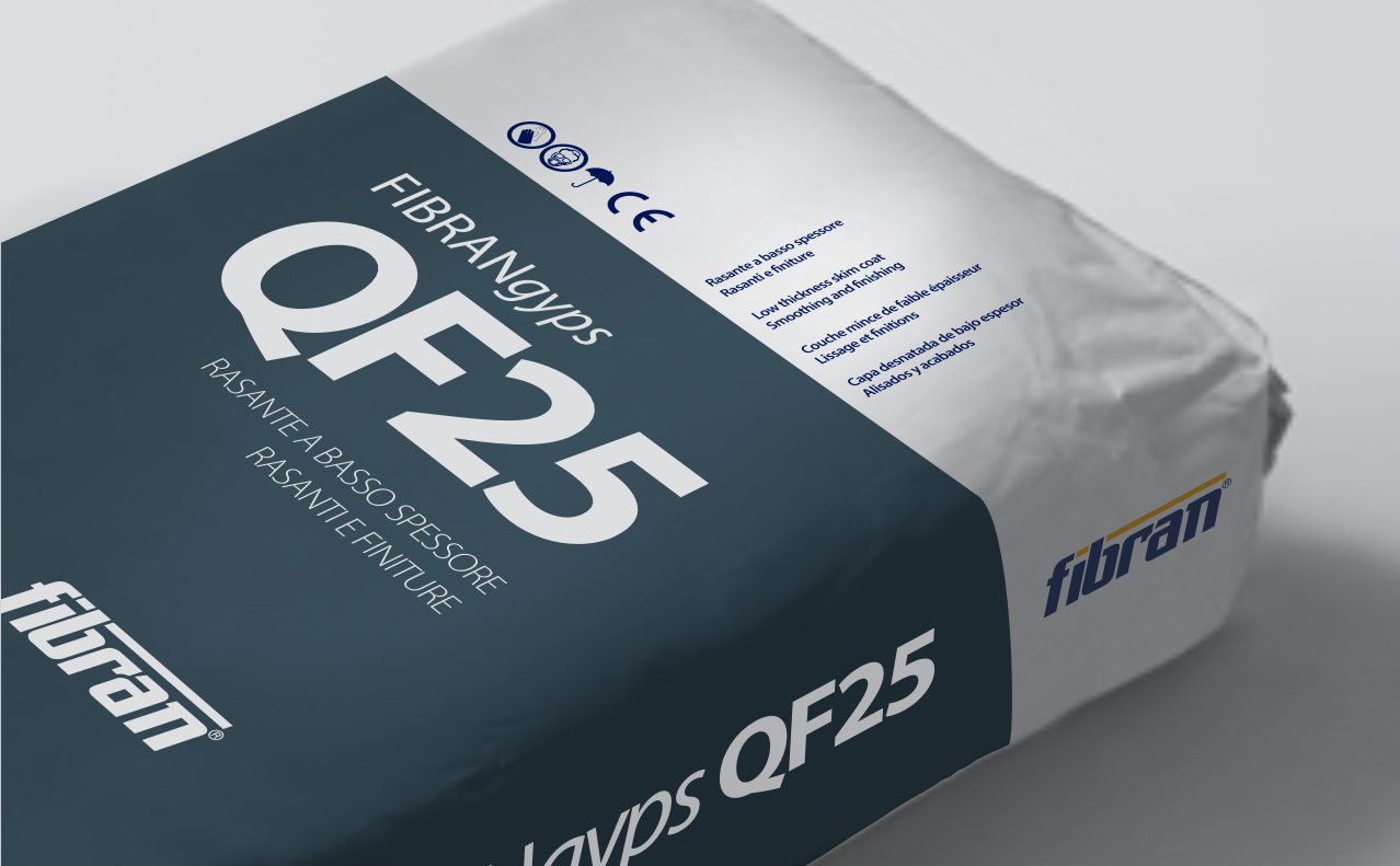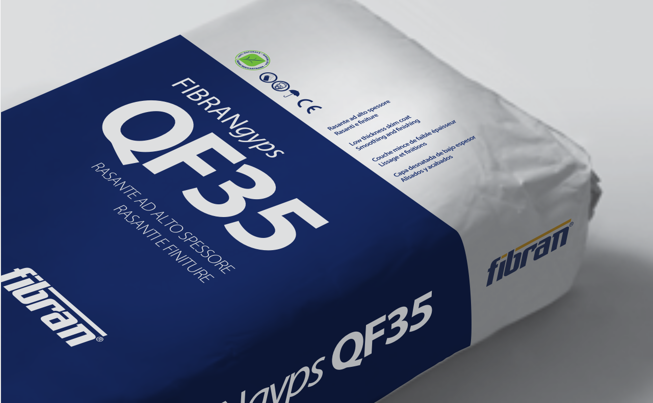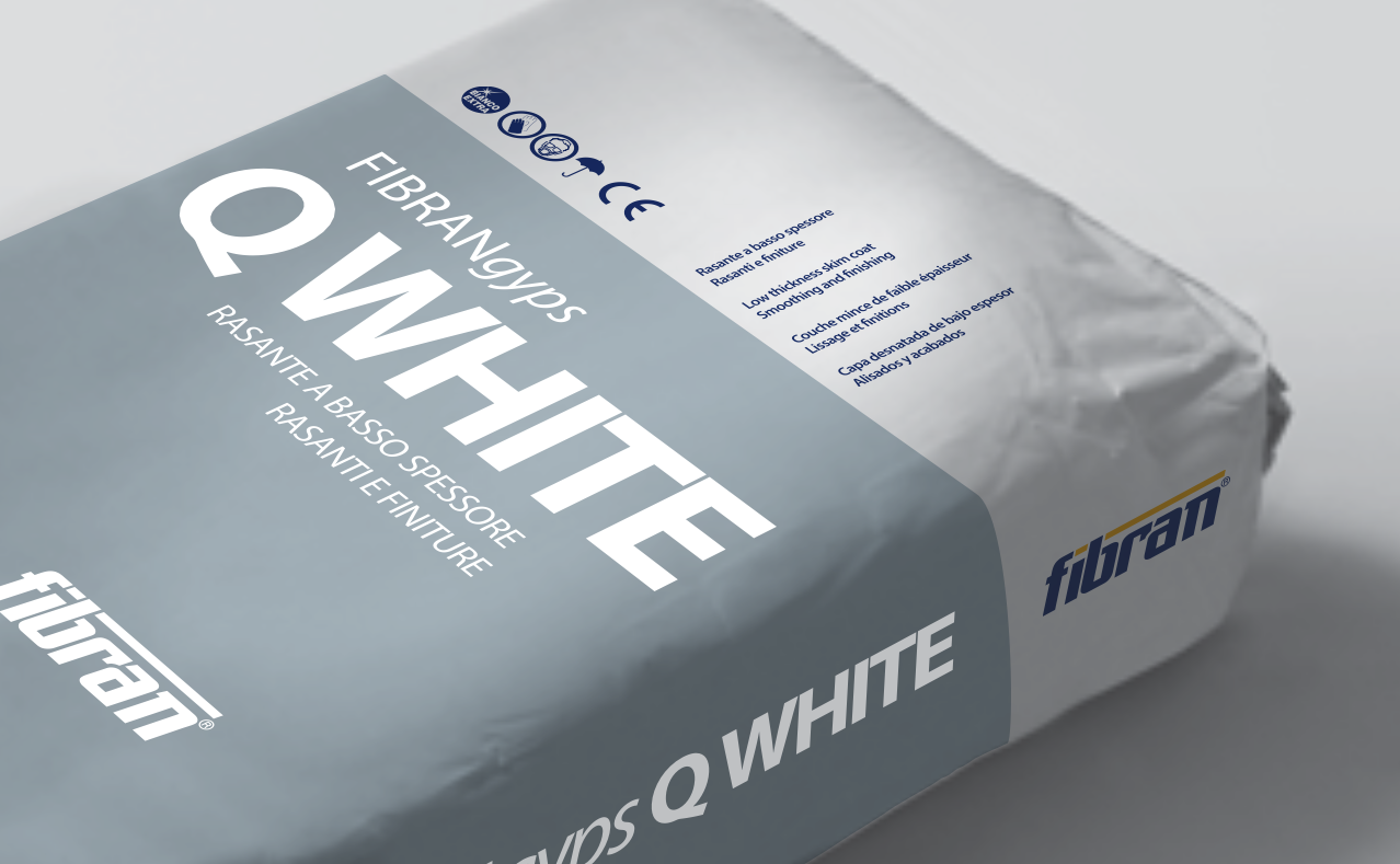 The new line of FIBRANgyps Q interior smoothing products consists of three products: QF35 high thickness, QF25 low thickness and Q WHITE extra white. All composed of a mixture of hemihydrate calcium sulphate, hydrated lime, selected limestone aggregates, resins and specific additives.