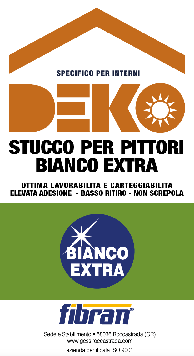 DEKO Filler is a mixture of calcium sulphate hemihydrate, resins and chemical additives that give the product excellent workability and adhesiveness. Specific for interiors. Ideal for filling cracks and small imperfections on traditional internal walls, for repairing decorative plaster filler, for performing total filling and smoothing, even at high thickness (with several successive coats), of walls with damaged plaster.