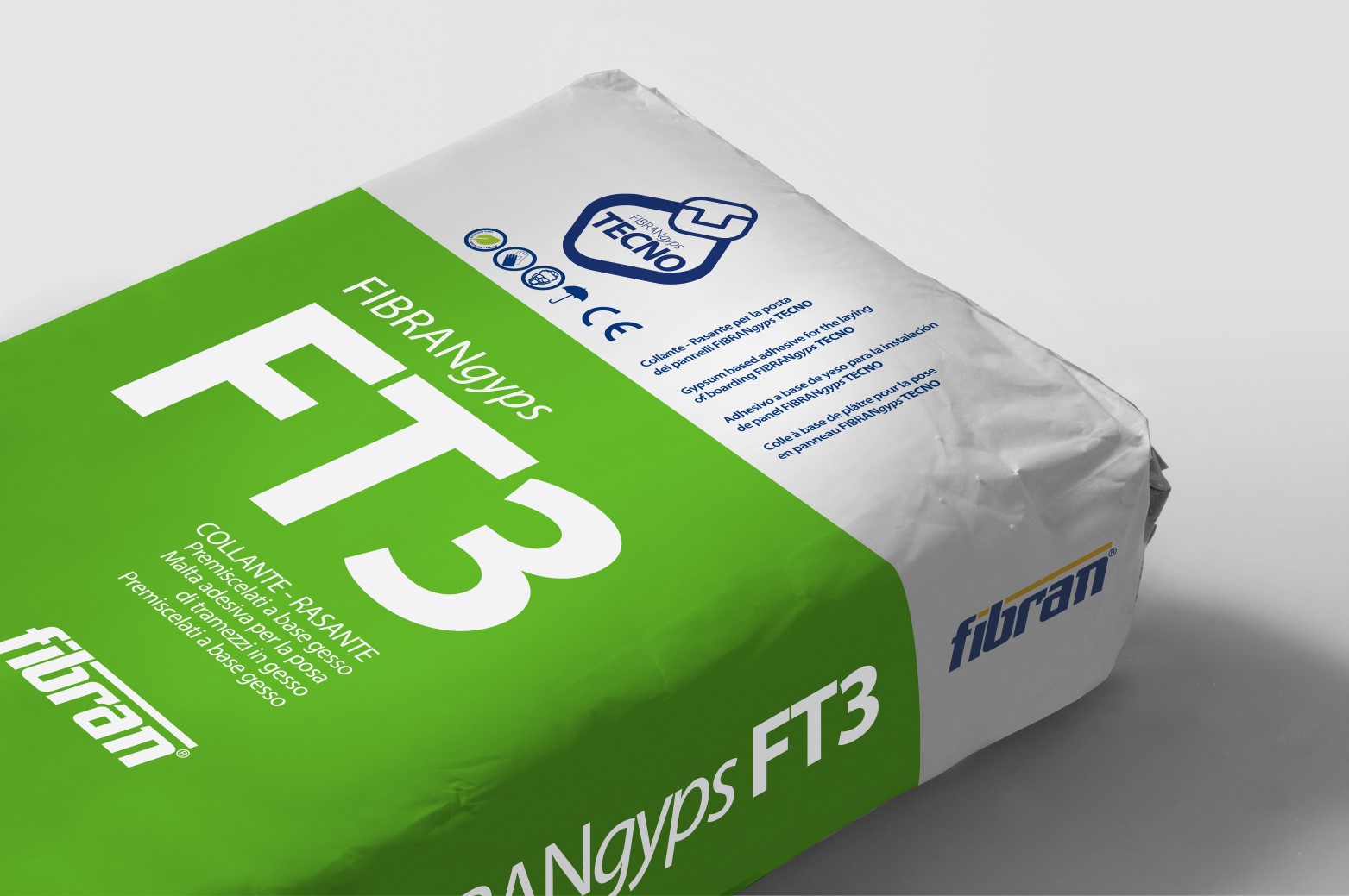 The FIBRANgyps FT3 adhesive – smoothing compound is a mixture of hemihydrate calcium sulphate, additives and resins for the installation and smoothing of FIBRANgyps TECNO panels, FIBRAN GYPSBLOC gypsum block, cellular concrete and for the bonding of gypsum products, frames and rosettes.