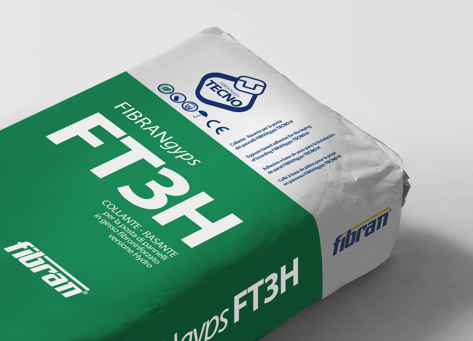 The FIBRANgyps FT3 H adhesive – smoothing compound is a mixture of hemihydrate calcium sulphate, additives and resins for the installation and smoothing of FIBRANgyps TECNO H panels (water-repellent panels), brick, cellular concrete and for the bonding of gypsum products, frames and rosettes.