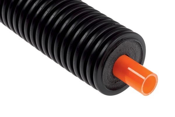 The product is a hyper flexible, pre-insulated piping system, combining both the flow and the return medium pipes in the same jacket, primarily intended for the transport of heating water or other media in underground distribution networks.