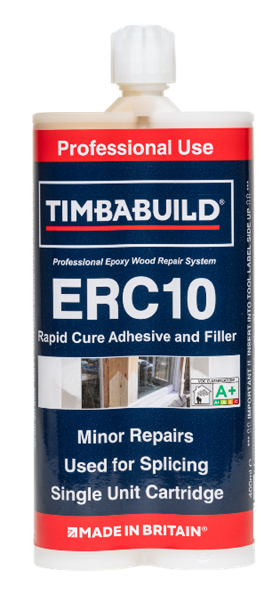 Timbabuild® ERC10 epoxy wood repair is a solvent free two component epoxy resin based wood repair system. The resin and the hardener are in a 1:1 volume ratio. The mixing ratio between the resin component and the hardener component is set automatically as the product is pushed out of the cartridge. Curing begins immediately after the components are mixed. The product is dispensed from a plastic cartridge using a manual tool. It was developed principally to rebuild small areas of decayed structures quickly and effectively. By removing the rotten wood, priming the surface, and then building up and moulding the surface. Similar to a putty consistency, the hardened epoxy can be sanded or planed exactly like wood to provide the perfect finish. It provides a physical and chemical bond which is stronger than the original wood.