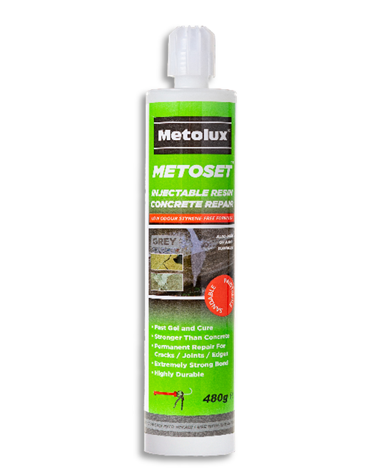 Metoset Injectable Concrete Repair is a styrene free two component polyester resin concrete repair resin used for cracks and sealing joints. The resin and the hardener are in a 10:1 volume ratio. The mixing ratio between the resin component and the hardener component is set automatically as the product is pushed out of the cartridge. Curing begins immediately after the components are mixed. The product is dispensed from a plastic cartridge or foil tube cartridge through a static mixer using a manual, battery-operated or pneumatic extrusion tool. It was developed principally to seal cracks, joints, chipped edges and other imperfections in concrete, brick or other cementituous surfaces. It is also used for jointing and bonding.