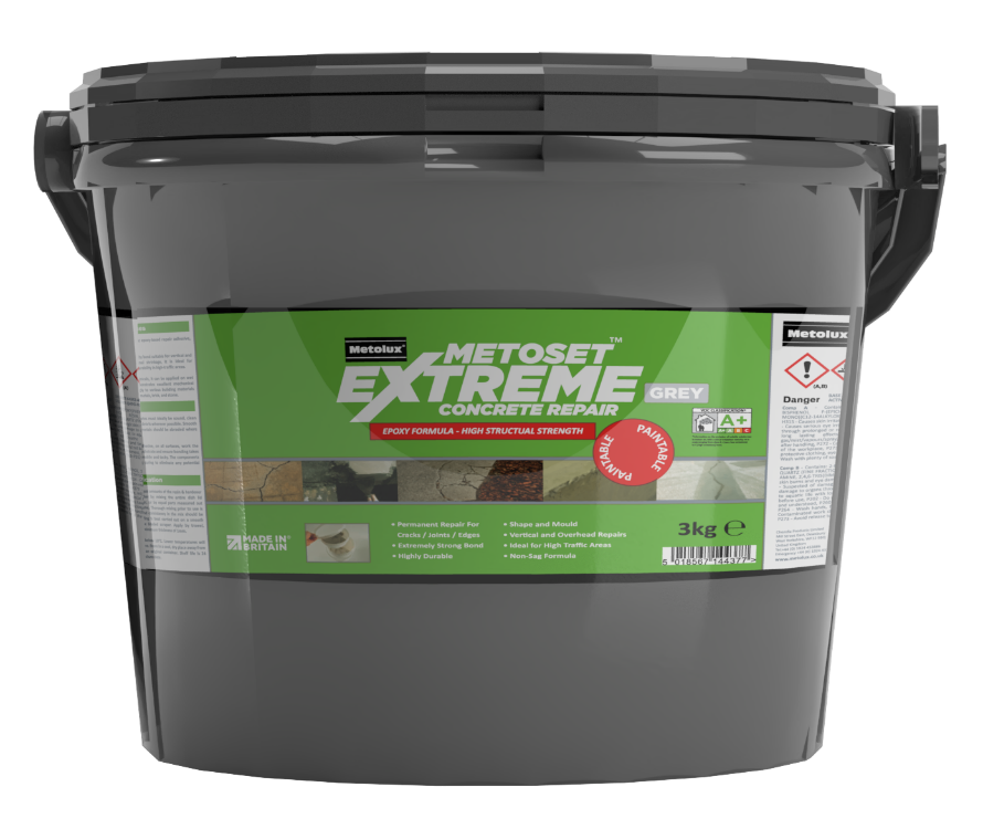 Metoset Extreme is a 1-1 ratio solvent free, structural repair filler & adhesive. It is designed primarily for repairs in concrete elements, hard natural stone, fibre cement, mortar, bricks, blocks, masonry, render etc. It is particularly suited for vertical and overhead repair of corners and edges, hole and void filling, joint arrises, joint filling and crack sealing, crack filling and sealing. The product has a unique packaging system which houses the resin and hardener in one container, the hardener housed in the dish lid.