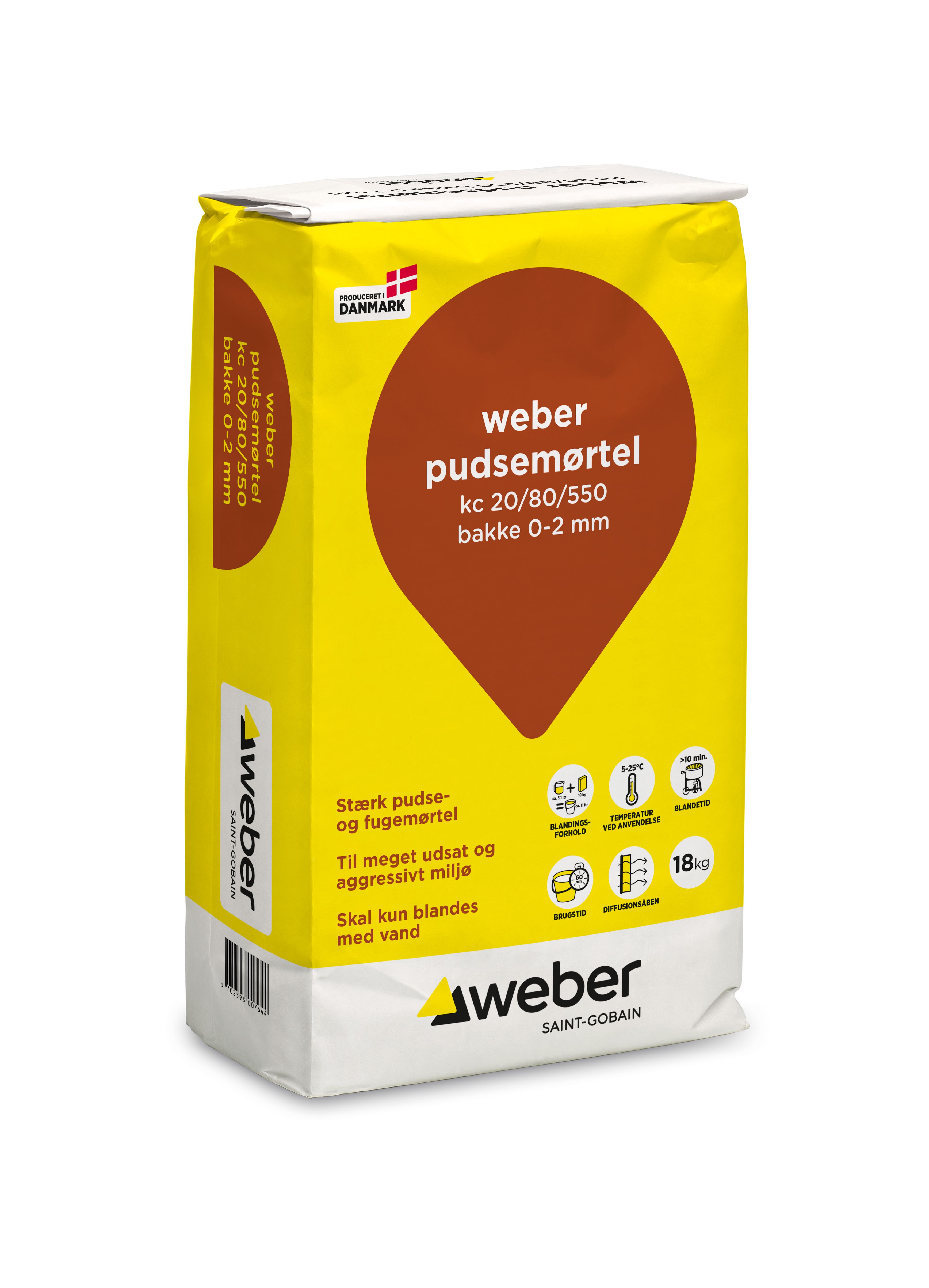 weber Pudsemørtel KC 20/80/550 Bakke 0 - 2 mm is used for plastering tasks on mineral substrates. The substrate's pre-treatment and the overall construction of the plaster layer are assessed individually based on the task's location, environmental impacts, and durability requirements.