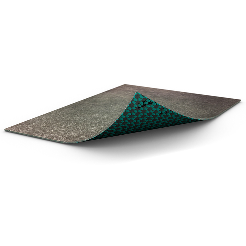 It's provided in rolls and treated on both sides with synthetic polymeric resins. Its bottom layer is lightly textured with small, embossed stems. It has been specifically designed to be loose laid over existing concrete subbase. The GREEN version of this product, characterized by green-colored stems, is free from phthalates and synthetic plasticizers obtained from fossil sources, which have been completely replaced by natural bio-based plasticizers obtained from plant-based, rapidly renewable biomasses of European origin, and ensures a 35% content of bio-based carbon in this product, as certified by the USDA (United States Department of Agriculture) BioPreferred® program. The combination of the underlayment guarantees the stability of the system while providing complete protection against high humidity rates coming from subfloor, which significantly extends the product life.
