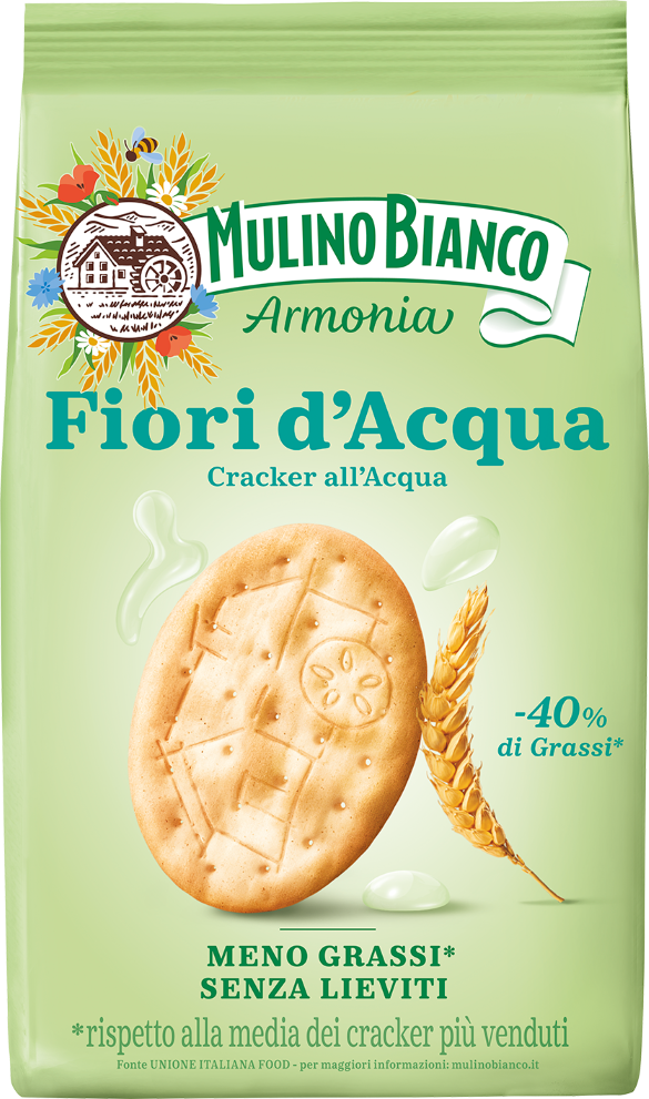 Italian description of the productI Fiori d'Acqua sono cracker leggeri e croccanti all'acqua realizzati nello stabilimento italiano di prodotti da forno di Castiglione delle Stiviere (MN). Vengono confezionati nel formato da 250 grammi e sono pronti per il consumo. Per maggiori informazioni relative al prodotto visitare il sito https://www.mulinobianco.it/fiori-dacqua