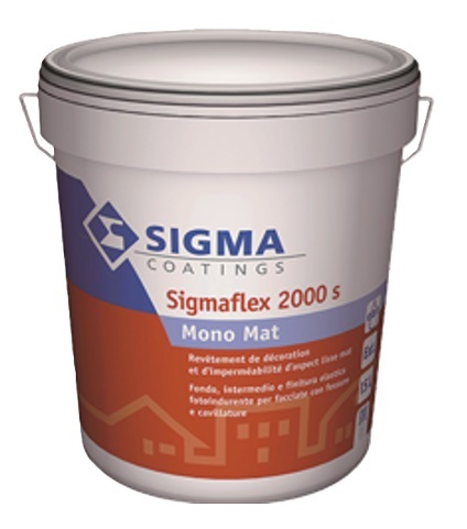 Photo-hardening elastic acrylic finish with a matt appearance. Thanks to its special formulation, Sigmaflex 2000S Mono Mat can be used as a single product as a base-intermediate-finish. Ideal for treating normal and pre-mixed plasters, concrete panels, systems and coverings in general, with the presence of cracks and crazing. Crack resistance class A1-A5 according to EN 1062-7; anticarbonation property; class C1 according to EN 1062-6