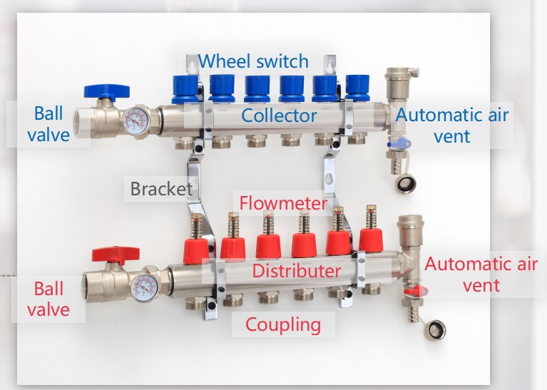 Rifeng Manifold, the representative of metal device made up of copper, could be used together with Rifeng PEX/PE-RT and multilayer pipe as system mainly for water heating application. The end of water supply pipe is a water distributor, and the end of water return pipe is a water collector. The manifold series include FS and FN manifold according to different producing process. Rifeng manifold consists of air vent valve,ball valve, wheel switch, collector,distributer, flowmeter and coupling(see below first picture).