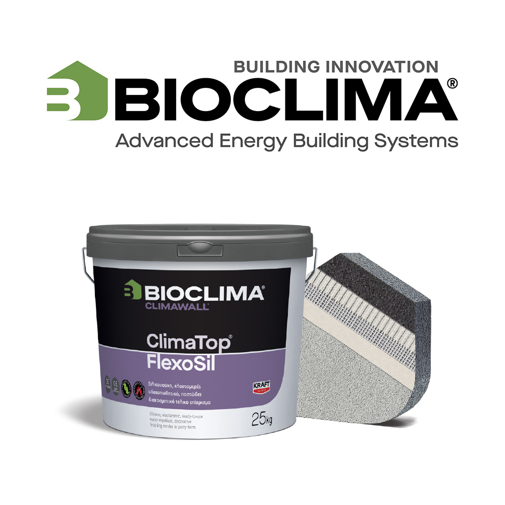 ClimaTop® FlexoSil is a decorative, ready-to-use in pasty form, acrylic finishing render. It is based on a combination of high quality acrylic and silicone resins, with excellent elasticity and water-repellency, natural granules of suitable graded granulometry and additional enhancers. It also contains lightweight microspheres from 100% recycled expanded glass (Recycled Glass Technology) providing excellent applicability, surface uniformity and advanced mechanical properties. ClimaTop® FlexoSil ideally combines high hydrophobicity and breathability, with great elasticity offering excellent protection in building constructions.