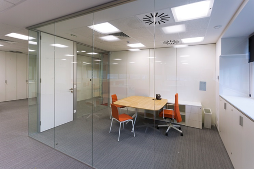 The KUBIK structure, also referred to as ST-700, is a self-supporting aluminum frame with concealed floor fixation, designed to support the various modular partition systems of the TREBE SERIES.