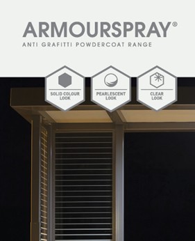 The Armourspray range is a collection of solid, pearlescent and clear finishes with high chemical resistance allowing the removal of most forms of graffiti, delivered with warranty grade advanced highly durable polyurethane thermosetting powder. Recommended usage includes public transport infrastructure and street furniture.