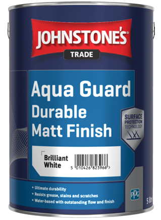 Johnstone’s Trade Aqua Guard Matt is our most durable water based matt paint for interior wood and metal. Innovative Surface Protection Technology provides the ultimate defence against scratches, wear & tear, and greasy finger marks, for a long-lasting finish. Johnstone’s Trade Aqua Guard Matt also has enhanced application qualities with outstanding flow, excellent hiding power and long-lasting whiteness*. *Long-lasting whiteness is applicable to Brillinat White only