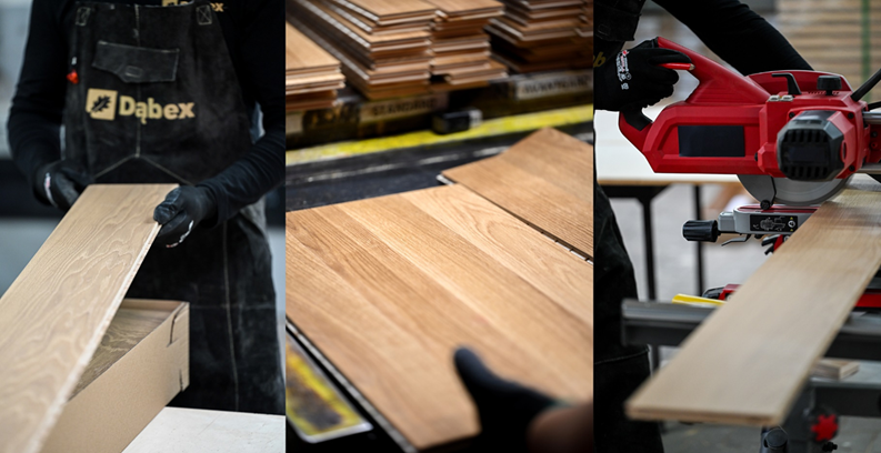 Dąbex two-layer wooden floors are finishing elements designed for use inside residential and public utility buildings. They consist of two permanently bonded layers: a wear layer made of solid oak wood (thickness 3–6 mm) and a support layer made of coniferous or deciduous wood (thickness 8–9 mm). This construction ensures high dimensional stability and compatibility with underfloor heating systems.