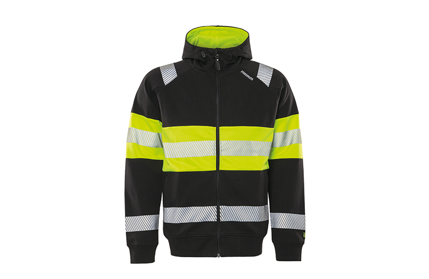 High vis full-zip hoodie made of organic cotton in a neat double-faced stretch material. Hooded sweatshirt jacket in soft stretchy cotton providing excellent comfort and freedom of movement. Fluorescent parts made of recycled polyester. PFAS free. Concept: Stiby