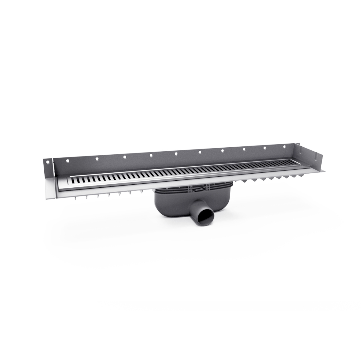 Linear floor drain for close-to-the-wall installation. Comes in versions 600 to1000. Stainless steel frame and grating with Rib pattern. Outlet with a water trap with low built-in height. Version with an easy-to-clean water trap.