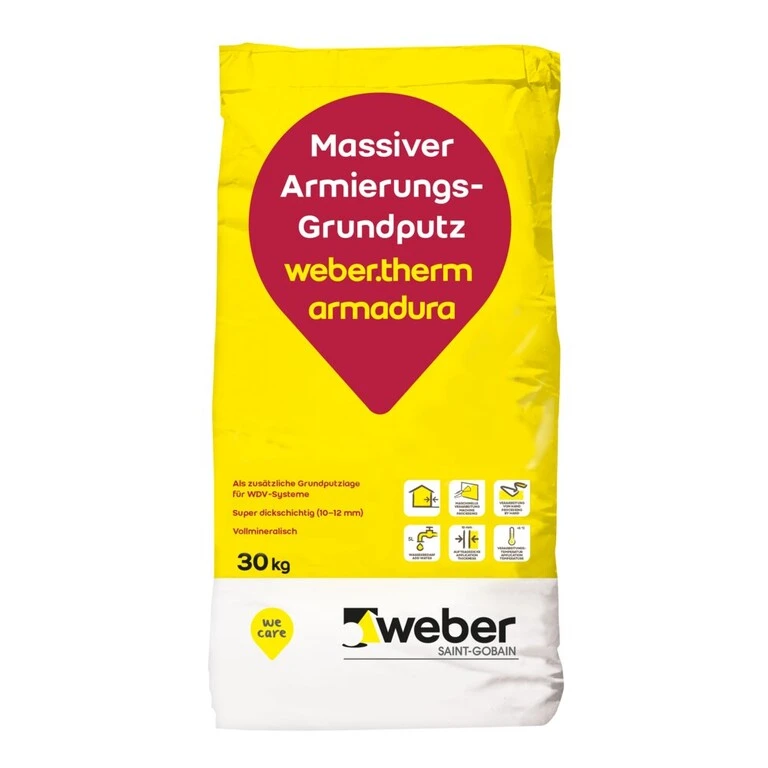 Weber.therm armadura base is a factory-mixed, mineral dry mortar in accordance with EN 998-1, designed for outdoor use. It can be applied as a thick-layer, solid and mineral reinforcing mortar or render within the high-performance, massive and fully mineral Etics (External Thermal Insulation Composite System) weber.therm circle. The base coat render of this system is particularly suitable for the facade insulation of buildings where a massive, dismantlable and recyclable structure is required.