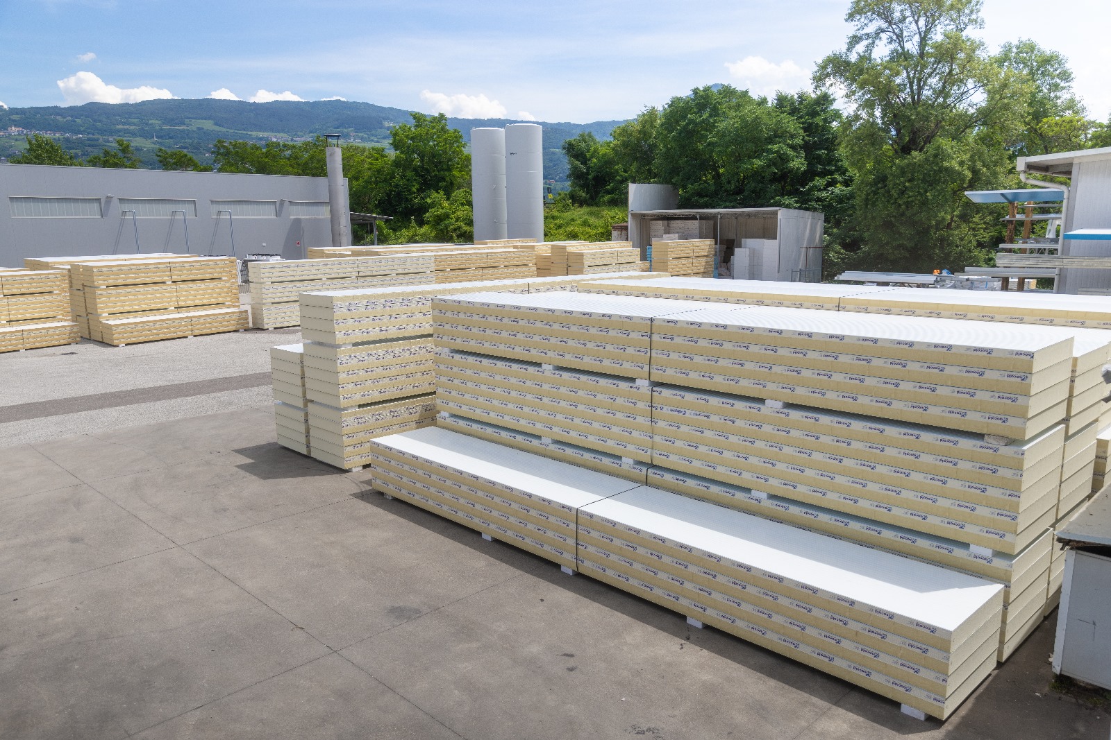 Isocold Italia S.r.l.s polyurethane sandwich panels are manufactured through a continuous process at both the operational and legal headquarters in via ai Vodi, 46 - 38015 Lavis (TN). Polyurethane sandwich panels are used in many industrial applications (especially in the beverage and food refrigeration industry) and civil applications thanks to their excellent insulating and structural properties.The sandwich insulation panels produced by ISOCOLD Italia s.r.l. are made of galvanised and painted steel facings and insulated with a rigid polyisocyanurate-based insulation mixture with a density of 38 kg/m3 10%. To meet the different needs of customers, the panels are available in three different models.