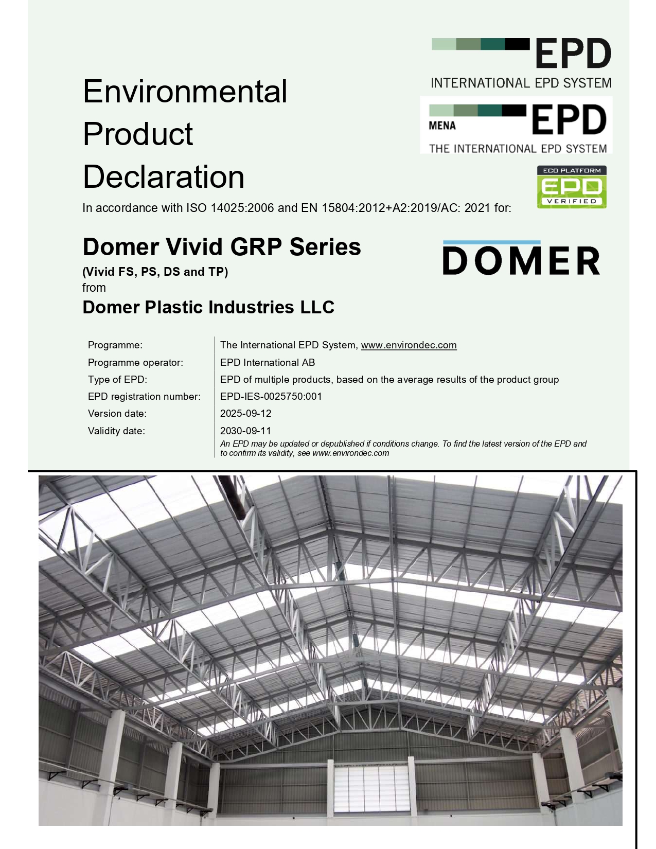 This EPD represents an average of the product variants within the Domer Vivid series. Environmental data and life cycle impacts are calculated based on a representative mix of products, reflecting the typical material composition, manufacturing processes, and performance characteristics across the series.