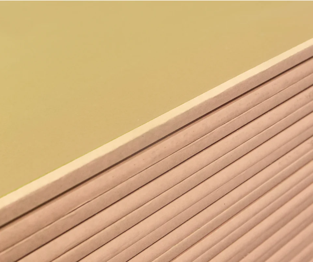 Placa de Yeso RF 5/8” is a fire-resistant gypsum board, reinforced with glass fiber and faced with recycled reinforced paper. Its Type X core provides greater structural strength under fire conditions and better acoustic insulation. Its front face is ivory pink and its back is dark brown. It complies with the fire safety standard EN 520, classification A1, and NTC 6159.
