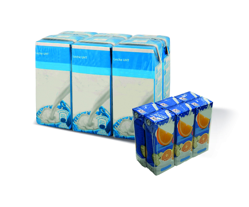 Both the shrink film for the 6-packs of milk and for the 6-packs of juice are made of a mix of low density polyethylene (LDPE) and linear low density polyethylene (LLDPE). The material is extruded and rolled in the reels that are fed to the filler, where the shrink film receives its final shaping by applying heat.