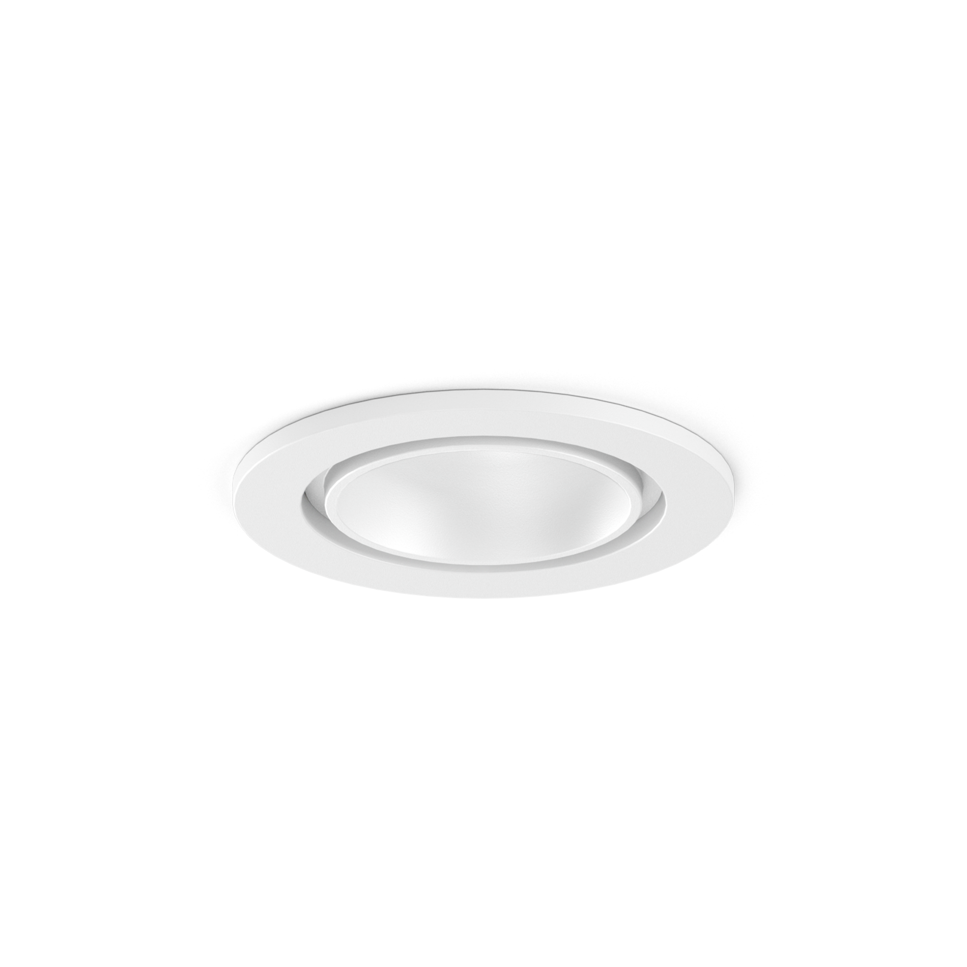 Round recessed spotlight; installation without tools in mounting set (trimless or with trim) with ball catch system; surface lacquered; installation possible in different housings; choice of adjustable / fixed symmetric or asymmetric radiation characteristic; variants with symmetric radiation characteristic: precise radiation characteristic due to high quality lens system; variants with asymmetric radiation characteristic: high-quality reflector with micro-faceted, aluminum-vaporised surface; COB (Chip on Board) technology for maximum efficiency (ADJUSTABLE and DOWNLIGHT); no multiple shadows; efficient LEDs with very good colour rendering