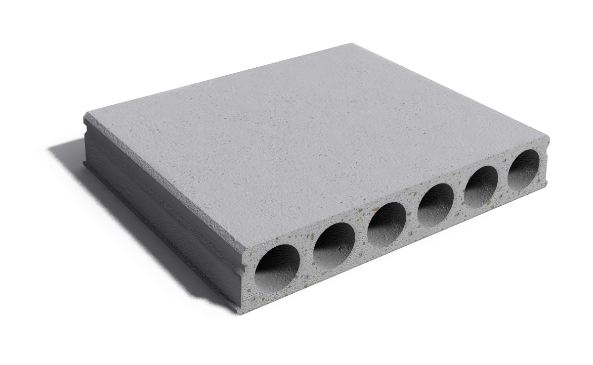 A precast, prestressed concrete structure with hollow cores, making it lighter in weight and more material-efficient compared to solid concrete slabs.
