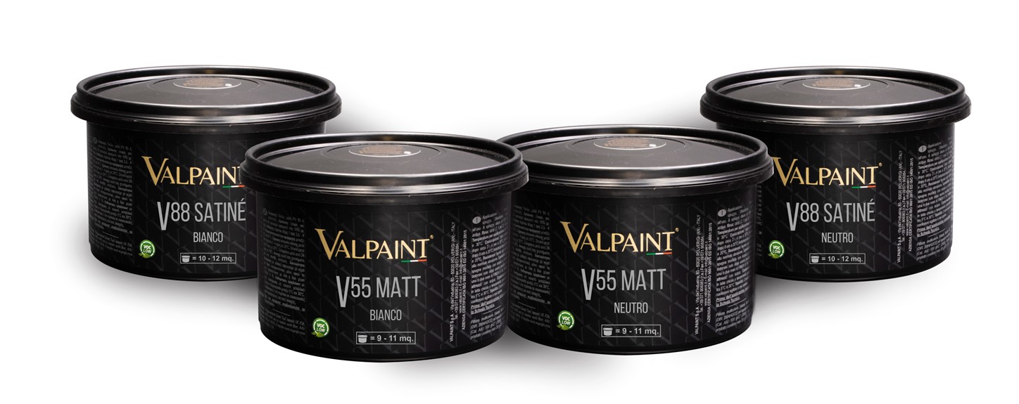 V55 is decorative water-repellent and anti-bacterial water-based enamel for interiors (yield 9-11 m²/lt). The chemical composition adds to traditional mould-prevention properties for walls, the bacteria proliferation inhibition due to silver ions to guarantee the sanification of the indoor environment.