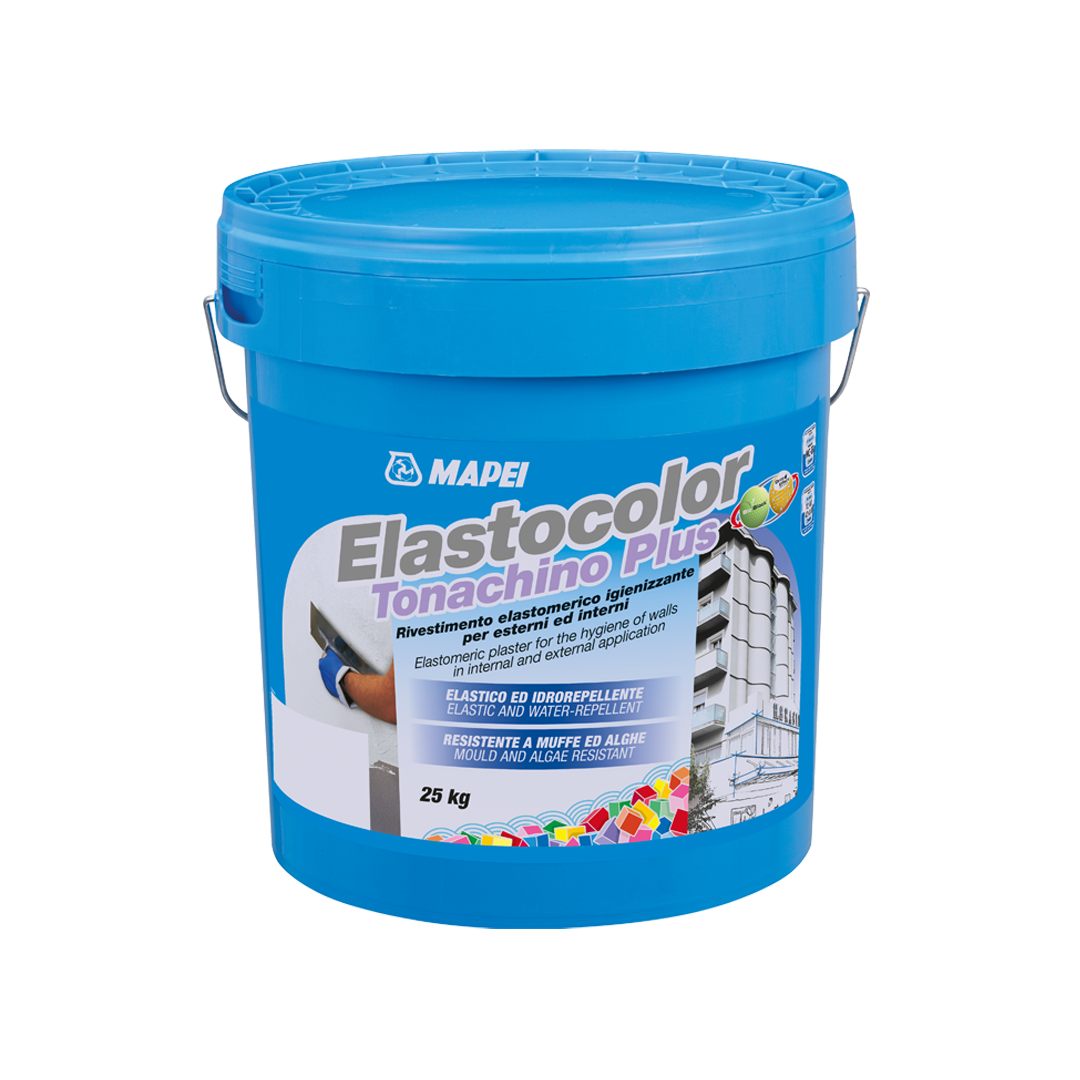 Elastocolor Tonachino Plus is a fibre-reinforced elastomeric coating which, thanks to its high elasticity, including at low temperatures, has the capacity to follow and absorb small deformations in substrates. Also, the fibres contained in the product form an interwoven strengthening matrix, similar to “non-woven” fabric, with the capacity to withstand deformations in the coating and to hide any hairline cracks in the finishing layer.